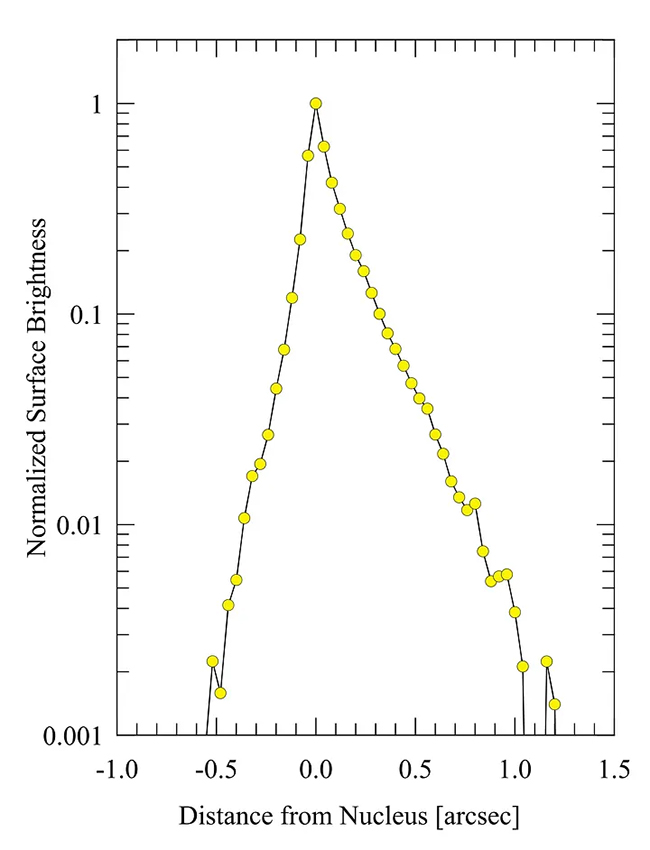 Luminosità superficiale in funzione della distanza angolare dal nucleo di 3I/ATLAS nell’immagine del telescopio spaziale Hubble. La luminosità è stata mediata su una striscia larga 0,8 secondi d’arco lungo l’asse che collega 3I/ATLAS al Sole. (Credito: Figura 3 da D. Jewitt et al. 2025)