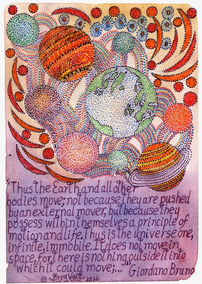 In questo saggio, ho presentato quattro straordinarie acquerelli di una serie creata dal celebre artista Greg Wyatt. Queste acquerelli incorporano affermazioni ispiratrici di Giordano Bruno e Marsilio Ficino. Questo è l’ottavo in una serie di saggi, in cui Greg e io collaboriamo sull’interfaccia tra arte e scienza. Il primo saggio di questa serie, intitolato “Musica delle Sfere Cosmiche” è apparso qui; il secondo saggio, intitolato: “Cascate Cosmiche nelle scogliere del Spazio-Tempo” è apparso qui; il terzo intitolato “Elementi mancanti nel Puzzle Cosmico” è apparso qui; il quarto saggio, intitolato: “Perché esistiamo?”, è apparso qui, e il quinto intitolato “Ispirazione dalle Stelle”, è apparso qui, il sesto intitolato: “Potremmo comprendere come funziona il Cosmo prima di comprendere come funziona la vita”, è apparso qui, e il settimo intitolato “L’Uomo sopravvivrà per milioni di anni”, è apparso qui.