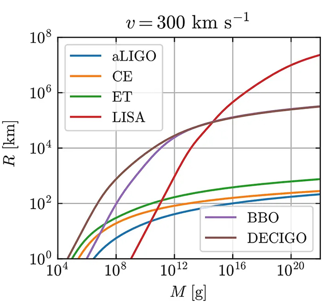 A titolo illustrativo, la figura seguente mostra la distanza massima, R, dai rivelatori di onde gravitazionali esistenti e futuri, alla quale è rilevabile un sorvolo di un oggetto interstellare di massa, M. La trama assume una velocità dell’oggetto di 300 chilometri al secondo, dieci volte più veloce della velocità orbitale della Terra attorno al Sole o della velocità massima dei razzi chimici convenzionali.