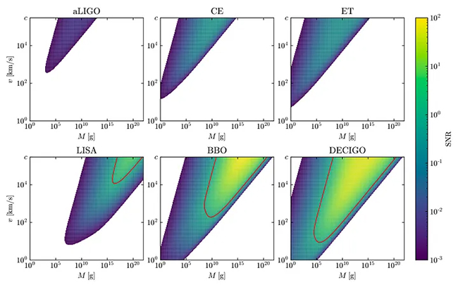 La figura successiva mostra il rapporto segnale-rumore (SNR) dall’incontro più ravvicinato previsto entro un periodo di osservazione di 10 anni, assumendo che gli oggetti costituiscano la materia oscura. Il rapporto segnale-rumore è mostrato per diversi rivelatori di onde gravitazionali in funzione della massa, M, e della velocità, v, degli oggetti. La linea rossa indica il contorno per cui SNR = 1.