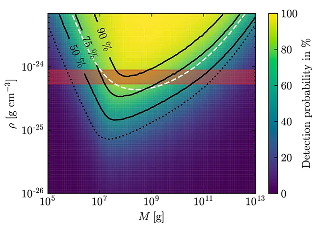 La probabilità che DECIGO rilevi almeno un evento dal passaggio ravvicinato di oggetti compatti dipende dalle loro masse individuali e dalla loro densità di massa locale totale nella Via Lattea. La figura successiva assume un tempo di osservazione di 10 anni e orbite casuali per gli oggetti interstellari. La banda rossa ombreggiata corrisponde all’intervallo delle ultime stime osservazionali della densità locale di materia oscura. La linea tratteggiata indica il contorno della probabilità di rilevamento del 50%, per una riduzione del livello di rumore atteso del rivelatore di un fattore 2.