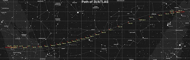 Il percorso apparente di 3I/ATLAS nel cielo terrestre. (Credito: Wikimedia)