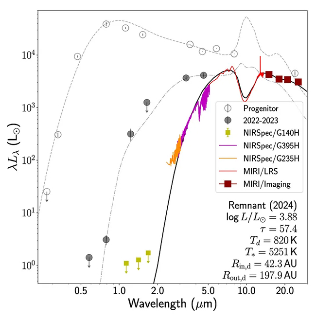 Il nostro articolo presenta osservazioni infrarosse del resto stellare dal Telescopio Webb e osservazioni a raggi X dall’Osservatorio a raggi X Chandra nel 2024. I dati di Webb rivelano una sorgente estremamente rossa, con una forte assorbimento spostato verso il blu da gas molecolare (CO, CO2, H2O e SO2) e polvere. La modellizzazione della polvere conferma il continuo sbiadimento della sorgente centrale fino a circa il 7% della luminosità della stella progenitrice, circondata da un guscio di polvere su una scala paragonabile al sistema planetario attorno al Sole. Il gas molecolare include circa un decimo di massa solare di gas in espansione a cento chilometri al secondo vicino al bordo interno del guscio di polvere. Non viene rilevata alcuna sorgente di raggi X.