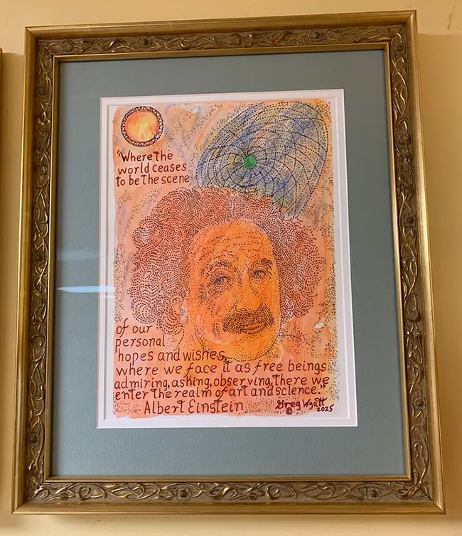 Un acquerello con un’intuizione sull’arte e la scienza di Albert Einstein: “Laddove il mondo cessa di essere la scena delle nostre speranze e dei nostri desideri personali, laddove lo affrontiamo come esseri liberi: ammirando, chiedendo, osservando, lì entriamo nel regno dell’arte e della scienza.” (Credito: Greg Wyatt)