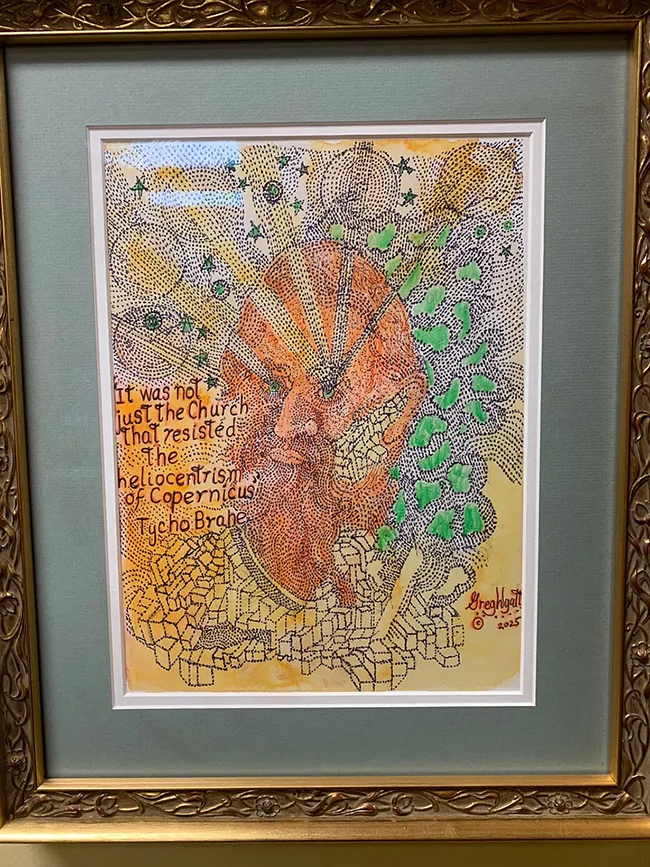 Un acquerello con una dichiarazione di Tycho Brahe, un rispettato astronomo che parla a nome della comunità scientifica: “Non fu solo la Chiesa a resistere all’eliocentrismo di Copernico”. (Credito: Greg Wyatt)