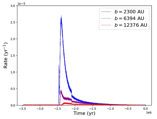 Abbiamo scoperto che l’intensità dello sciame cometario dipende fortemente dalla distanza di massimo avvicinamento di HD7977 al Sole (indicata con il parametro b), con possibili distanze di sorvolo che variano da 2.300 UA a ∼ 13.000 UA. Per l’approccio più vicino a 2.300 UA, la probabilità di impatto sulla Terra delle comete di 1 chilometro è aumentata di un ordine di grandezza rispetto allo stato stazionario prima del passaggio della stella. Questi risultati suggeriscono che il passaggio ravvicinato di HD7977 potrebbe aver causato un aumento del flusso di comete durante la transizione Pliocene-Pleistocene, il che potrebbe plausibilmente essere collegato ai cambiamenti ambientali sulla Terra durante quest’epoca.