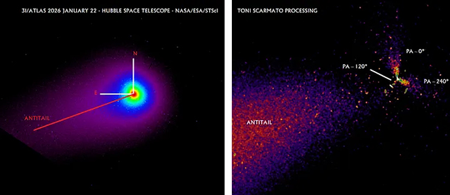 Una mappa di luminosità a falsi colori di 3I/ATLAS, scattata il 22 gennaio 2026 con un’esposizione di 170 secondi dalla fotocamera WFC3 UVIS (F350LP) del telescopio spaziale Hubble (pannello di sinistra). La mappa è stata elaborata tramite un filtro gradiente rotazionale di Larson-Sekanina, che rimuove l’alone a simmetria circolare attorno al nucleo, mostrando quattro getti (pannello di destra). La struttura del getto include una prominente anti-coda diretta verso il Sole e la Terra in quella data, insieme a un sistema di tre mini-getti che circondano il nucleo. Questi mini-getti sono equidistanti tra loro con un angolo di 120 gradi, ma uno di essi (etichettato con un angolo di posizione PA=120 gradi) è debole, forse perché è nascosto in un’orientazione sfavorevole rispetto alla Terra. (Credito immagine: Toni Scarmato, basato sui dati rilasciati da NASA/ESA/STScI qui)