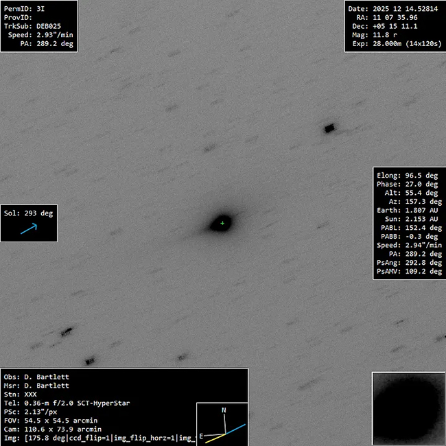Un’immagine di 3I/ATLAS, scattata il 14 dicembre 2025, con un tempo di integrazione totale di 2 ore e 22 minuti e senza filtro su un telescopio da 14 pollici (0,356 metri) a June Lake, California. Il campo visivo mostrato nel pannello inferiore si estende per 4,24 milioni di chilometri per lato. Una contro-coda verde-azzurra punta verso il sole in direzione in basso a sinistra. (Credito immagine: Dan Bartlett)