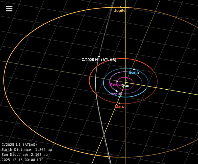 Posizione di 3I/ATLAS rispetto alla Terra e a Giove il 15 dicembre 2025. (Credito immagine: JPL Horizons)