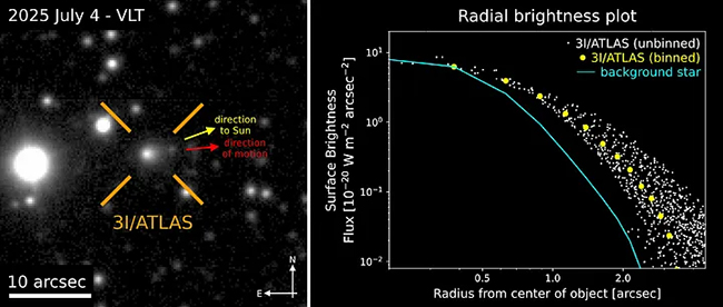 L’immagine di 3I/ATLAS ripresa dal Very Large Telescope in Cile il 4 luglio 2025 (a sinistra) da una distanza di 3,5 separazioni Terra-Sole, insieme al suo profilo di luminosità superficiale proiettato. La risoluzione angolare dei nostri migliori telescopi è circa mille volte peggiore di quella necessaria per risolvere un oggetto di pochi chilometri di dimensione. (Credito immagine: Wikimedia)