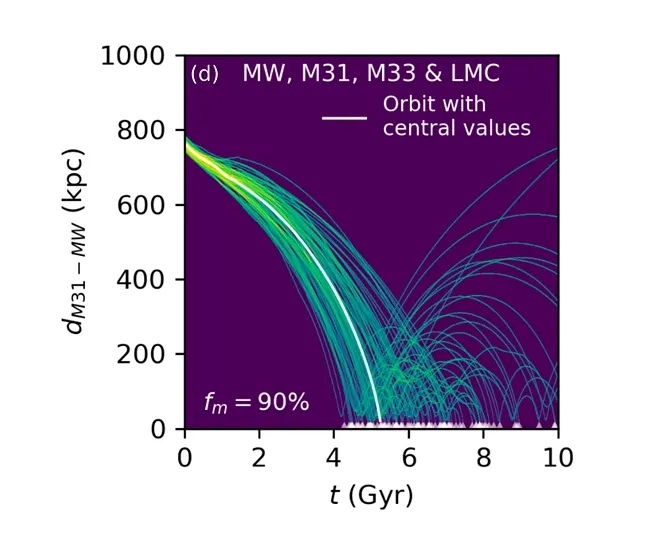 Attualmente, la Via Lattea e Andromeda (chiamata anche M31) stanno cadendo l’una verso l’altra a una velocità di 110 chilometri al secondo. Tuttavia, un articolo pubblicato qui nel 2024 ha sostenuto che la fusione non è garantita, dato l’influsso gravitazionale di altre galassie tra di loro — come M33 e la Grande Nube di Magellano (LMC). Mentre includere M33 aumenta la probabilità di fusione, l’orbita della Grande Nube di Magellano è perpendicolare all’orbita della Via Lattea — Andromeda e rende la loro fusione meno probabile. Gli autori hanno sostenuto che le incertezze nelle attuali posizioni, movimenti e masse di tutte le galassie consentono una probabilità del 50% che non ci sarà alcuna fusione tra la Via Lattea e Andromeda nei prossimi 10 miliardi di anni.