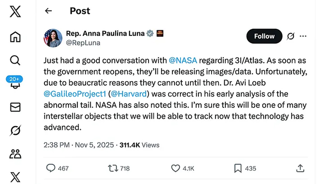 Il 2-3 ottobre 2025, la fotocamera HiRISE a bordo del Mars Reconnaissance Orbiter ha scattato immagini laterali di 3I/ATLAS con una risoluzione di 30 chilometri per pixel, mentre 3I/ATLAS passava a 29 milioni di chilometri da Marte. A seguito della presentazione di una lettera ufficiale alla NASA (accessibile qui), la brillante congressista Anna Paulina Luna ha twittato il seguente messaggio:
