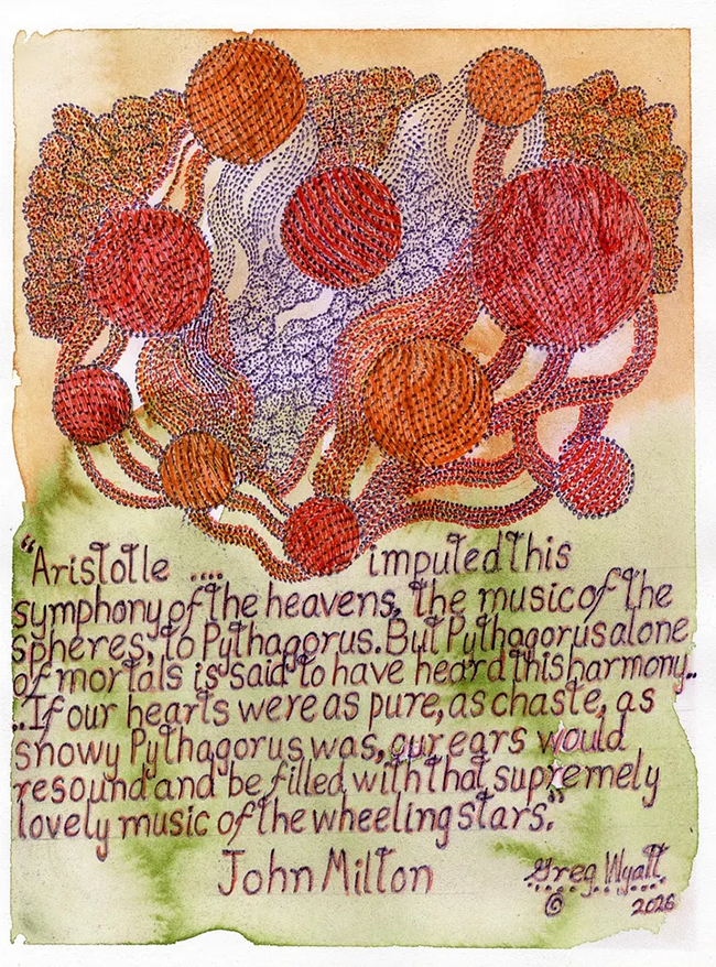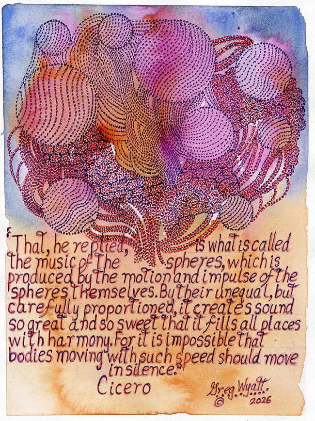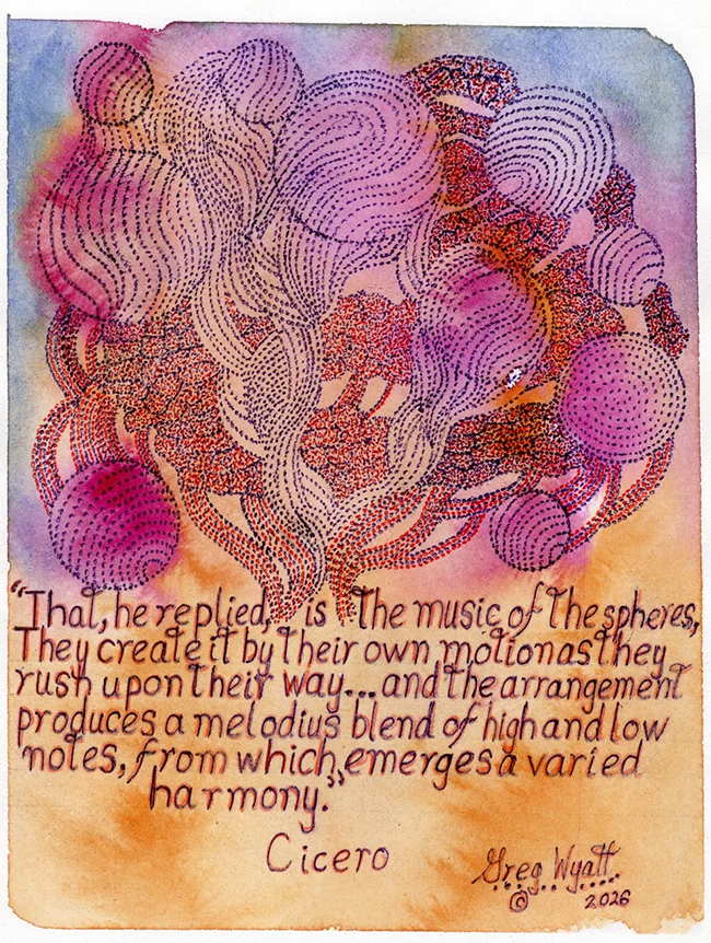 In questo saggio, presento quattro straordinarie acquerelli di una serie di sfere celestiali create dall’acclamato artista Greg Wyatt. Queste acquerellate includono affermazioni ispiratrici di Cicerone e John Milton. Questo è il primo di una serie di saggi, in cui Greg e io collaboriamo sull’interfaccia tra arte e scienza. Oggi ho detto a Greg che è un grande privilegio per me averlo come mio tramite per le arti.
