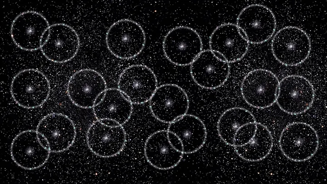 Illustrazione degli orizzonti sonori impressi da un insieme di perturbatori puntiformi sulla distribuzione attuale della materia — come tracciato dalle galassie. (Credito: Gabriela Secara/Perimeter Institute)