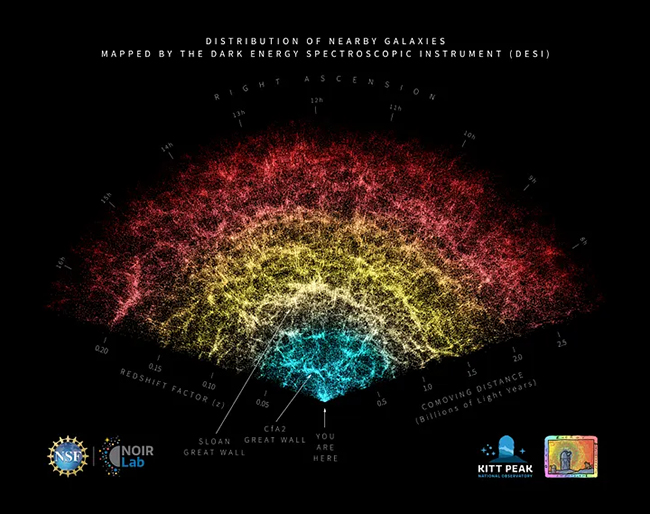 Una sezione della mappa tridimensionale delle galassie raccolta nel primo anno del sondaggio Dark Energy Spectroscopic Instrument (DESI). La Terra è in basso e ogni punto rappresenta una galassia. (Credito immagine: DESI Collaboration/NOIRLab/NSF/AURA/)