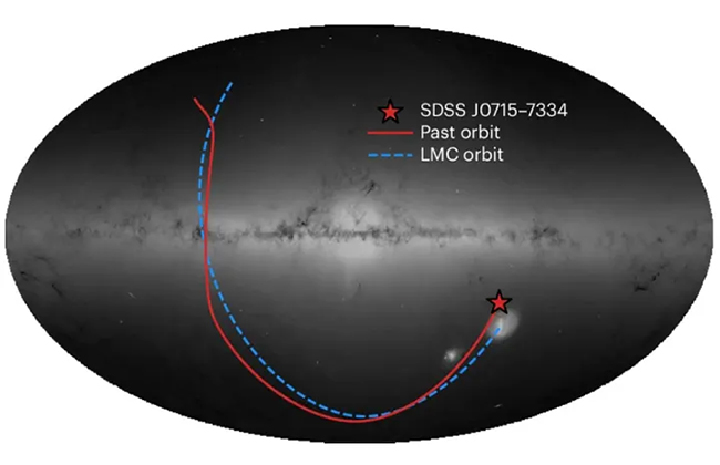 L’orbita della stella povera di metalli SDSS J0715−7334 negli ultimi 4 miliardi di anni in coordinate galattocentriche nel cielo, inclusa l’influenza gravitazionale della Grande Nube di Magellano (LMC). (Credito immagine: A.P. Ji et al. 2026)