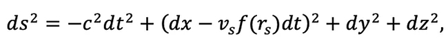Ma c’è anche un corrispettivo scientifico a questo concetto. Deformando lo spazio all’interno di una bolla, un veicolo spaziale all’interno della bolla potrebbe essere spinto a una velocità spaziale superiore a quella della luce. Questa possibilità si manifesta nel motore di Alcubierre, una soluzione teorica in stato stazionario alle equazioni di Einstein della Relatività Generale. La metrica di Alcubierre nelle coordinate temporali (t) e spaziali (x,y,z) può essere scritta come: